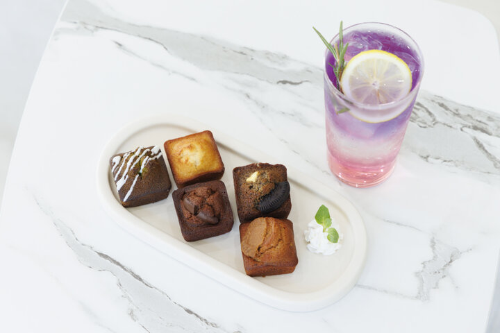 お店に足を運んだらぜひ試してもらいたいのが、2種類のイートイン限定メニュー。5種類のミニサイズのフィナンシェがひと皿にのった「お試しセット」(980円)とプレーンフィナンシェが付いた「アフォガード」(980円)のセットです。 「お試しセット」は1日30食限定。フィナンシェは、外はカリっと中はしっとりとした「プレーン」、本格的な抹茶パウダーをたっぷり使った「抹茶」、シナモンの香りたっぷりの「ロータス」、オレオを砕いたサクサク食感の「オレオ」、ビターな大人味の「チョコ」の5種類。気に入った味が見つかったら、自宅用やお友達用としてお土産としてテイクアウトもおすすめです。