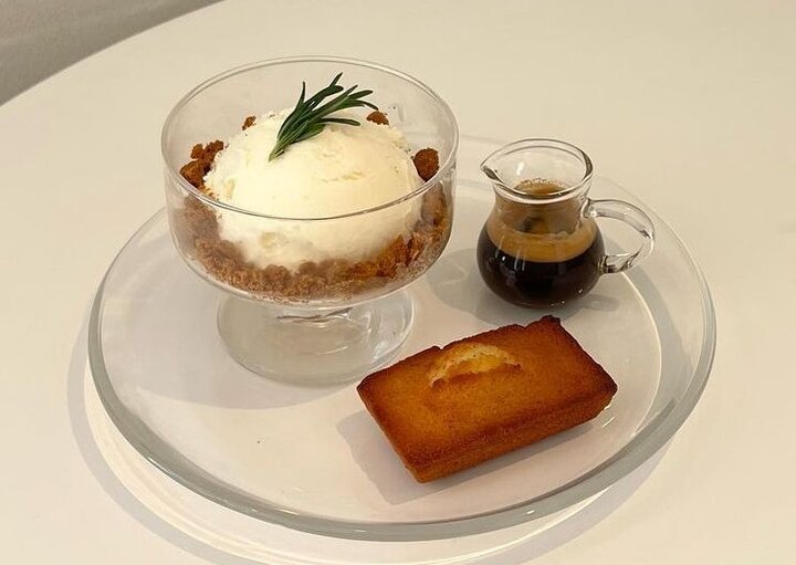 「アフォガード」は、アイスの周りにコーヒーと相性のいいロータスを砕いたものをトッピング。たっぷりのエスプレッソをいただきながら、サクサク食感もたのしめる一品です。お店の顔ともいえるプレーンフィナンシェを一緒に楽しめるのもうれしいところ。