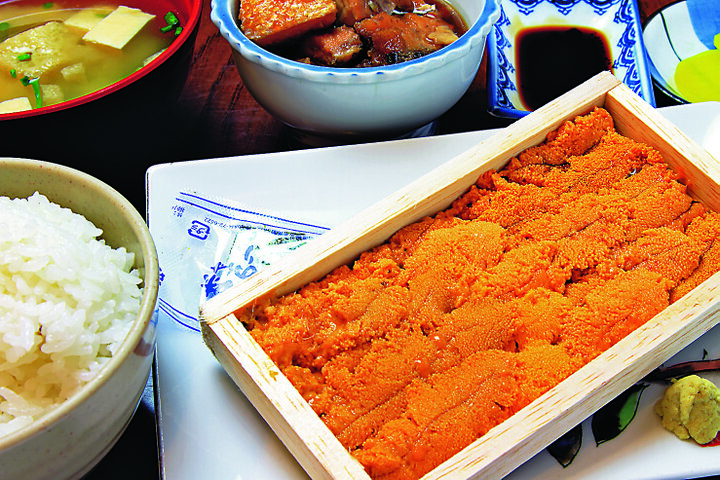 瓶詰めウニの発祥の地といわれる下関。特に北浦でとれるウニは香りが高く、なめらかな食感。通年食べられますが、旬は3・4月と6〜8月。生ウニ定食は箱ウニが丸ごと付き、刺身や丼など好みの食べ方で楽しめます。