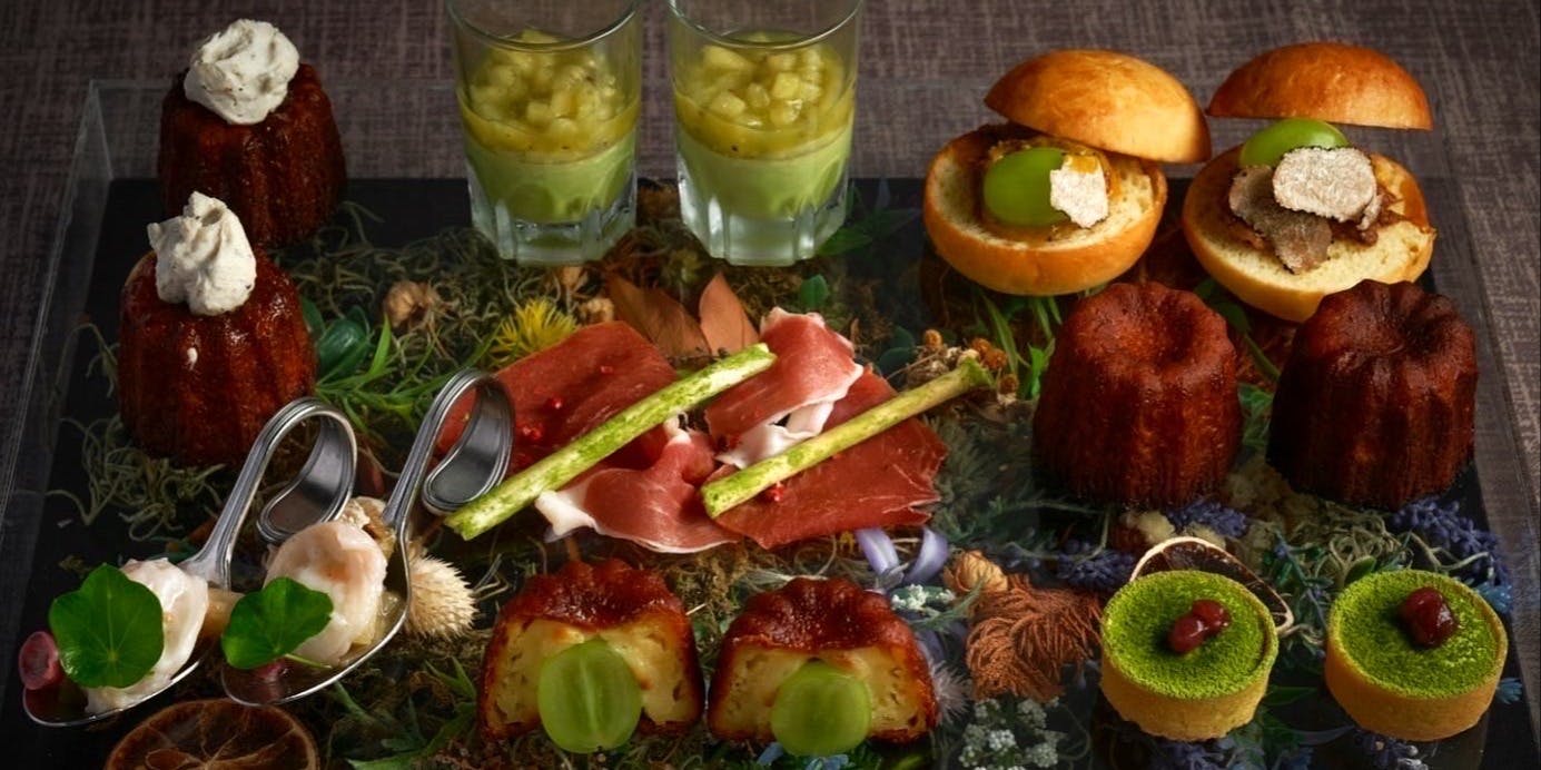 「抹茶カヌレのアフタヌーンティー」は、「抹茶の半熟カヌレ」「抹茶の生チョコレートタルト」などのスイーツをはじめ、「シャインマスカットと牛リエットのフラワースライダー」「あおさのりのゼッポリーニ 抹茶塩」などのセイボリーを、ドイツの Ronnefeldt社(ロンネフェルト)の紅茶とともに楽しむことができます。