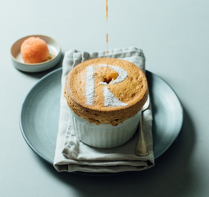 「Régalez-vous (レガレヴ)」(神奈川・鎌倉) パリ左岸のスフレ〈各日限定数100〉 大阪初イートイン!のこのお店は、パリの歴史あるレストラン「ラペルーズ」をはじめ、フランスで25年以上パティシエとして活躍してきた佐藤亮太郎さんがオーナーシェフを務める「レガレヴ」。「ラペルーズ」で提供していたレシピを佐藤シェフが現代風に再現したのがこのスフレです。 ナッツの芳醇な香りが漂うアーモンドとヘーゼルナッツのプラリネのスフレに、オレンジ、バニラ、シナモンが香るキャラメルソースをとろーりとかけていただきます。スフレのためだけに作られた別添えのブラッドオレンジのソルベで爽やかさをプラス。できたて熱々のスフレをぜひこの機会に味わって。