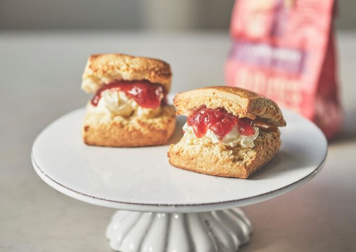「Ordinaire(オルディネール)」(京都) デンシャー地方の焼き立てクリームスコーン (1個 / 約直径7.5×高さ4㎝ )〈一人2個まで〉 京都新聞に連載のレシピが本になるなど、予約が取りにくい京都の洋菓子教室。今回は、イギリス・南東部のドーヴス・ファーム地方にて持続可能農法で栽培された、小麦本来の風味や香りがしっかりと味わえる小麦粉を特別に取り寄せ、現地同様香り高いバターを使用 。外側はさっくりほろり、内側はしっとりふんわりとした、より本場のスコーンに近い軽い食感と味わいを再現しました。 そんな焼きたての大ぶりスコーンに、なめらかなクロテッドクリームとほんのりローズティで風味付けした紅ほっぺジャムをサンド。本場さながらの優雅なひと時を楽しんで。