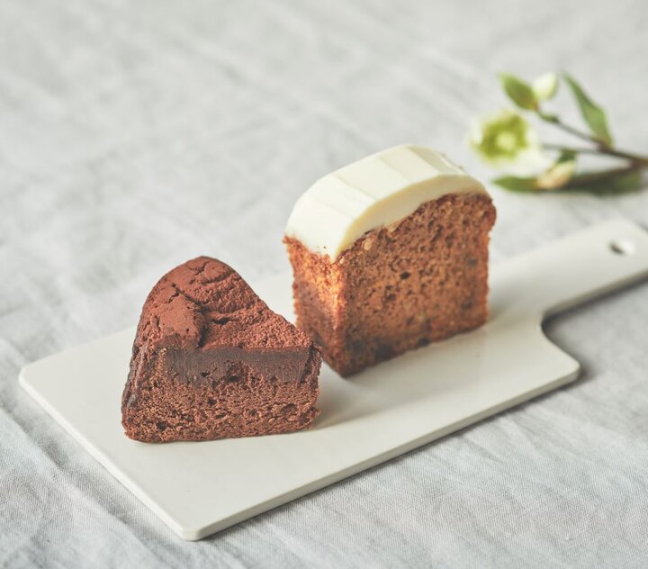 「ドゥラメール 焼き菓子店」(広島・海田) キャロットケーキ&ガトーショコラセット(1セット) 〈5/3(水・祝)のみ販売〉 ホテルのパティシエだった新谷夫婦が作る焼き菓子店。スイスの小さなチョコレート工場「フェルクリン」社のサオパルメ75%を使用したガトーショコラは、オープン当初からある「ドゥラメール」のスペシャリテ。ハイカカオながら焼成温度を変えていくことで、空気を含んだスフレのような質感と華やかな香りを楽しめます。 くるみとレーズン、シナモン入りのキャロットケーキは、フレッシュチーズのフロスティングがたっぷりかかってちょうどいい甘さ。深煎りのコーヒーと相性ぴったり。このセットは初日だけのお楽しみです。
