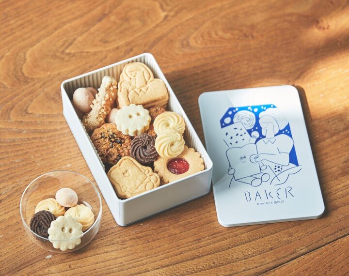 「BAKER」(兵庫・芦屋) 焼き菓子9種類詰合せ(230g) 自家製酵母パンとおやつのお店。国産小麦粉や喜界島の粗糖などこだわりの素材で作った、お店で人気の “ pokpok(ヴィエノワ)”や “ほろほろ”をはじめ、このクッキー缶のために考案したラズベリージャムサンドクッキーなど9種を詰め合わせました。 イラストレーターのkilldiscoさんのイラストもキュートです。