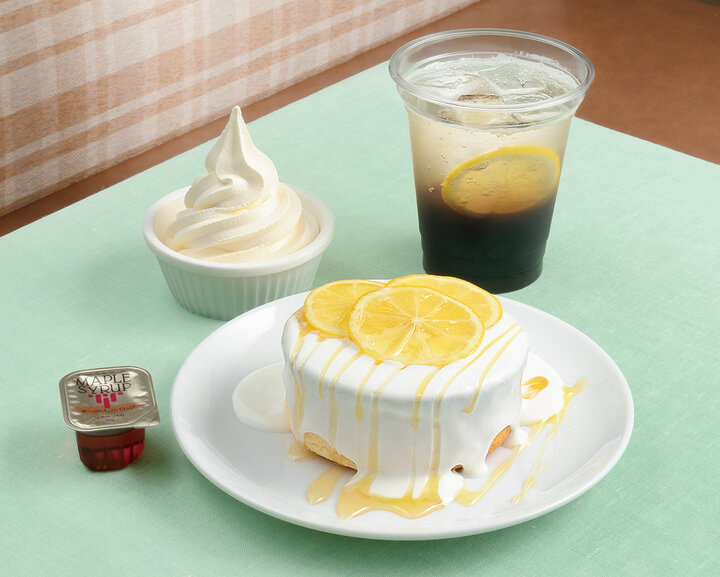 【キーコーヒー】◆地下2階5番地 《各日販売予定10点》 (1)「ハニーレモンパンケーキ(ヨーグルトソースかけ)」 (1セット/ミニソフトクリーム付) 《各日販売予定20点》 (2)「スパークリングハニーレモンコーヒー」 ふかふかのパンケーキに爽やかなヨーグルトソースとレモンソースをかけました。はちみつレモン入りのコーヒーと一緒にどうぞ。 ※はちみつを使用しています。 ※東武企画品 ※瀬戸田レモン