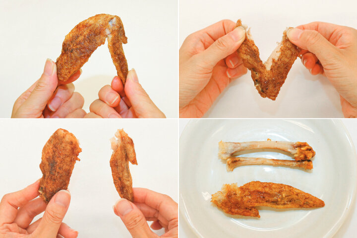 1(左上):手羽先を両手で持ち、関節部分をくいっとひねります 2(左下):身のたくさん付いた部分と、羽部分に分かれます 3(右上):身の多い部分は、2本の骨の間を裂いて、それぞれ食べます 4(右下):羽部分の皮も食べられるので忘れずに味わいましょう