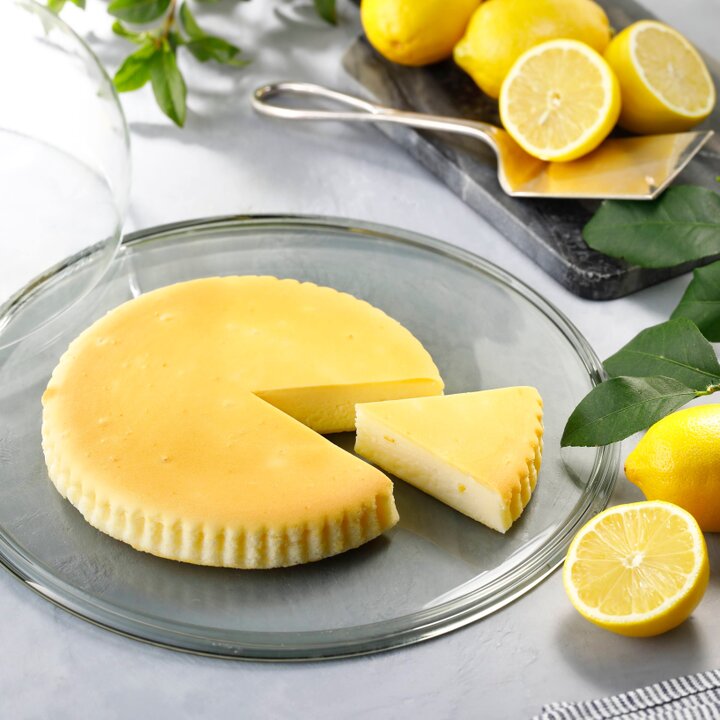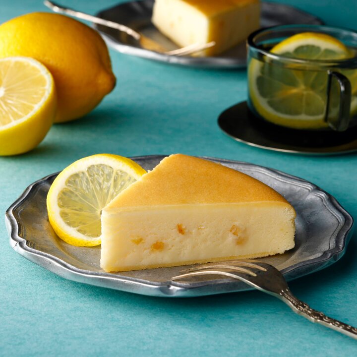 「御用邸レモンチーズケーキ」は、数種類のチーズをブレンドした生地に、白餡とレモンなどで仕上げたレモンの餡子とまるごとシロップ漬けにして細かく刻んだレモンを練り込みました。白餡を使うことで甘みがまろやかになり、レモンもシロップ漬けにすることで程よい甘さと酸味が引き立つ味わいに仕上げています。 また、「御用邸チーズケーキ」と同様に、しっとりとした食感とチーズの濃厚な味わいは残しながらもレモンの香りと酸味があと味としてひろがることで、よりさっぱりとした爽やかな味わいが楽しめます。さらに、生地のなかに見え隠れするレモンピールがアクセントとなるため、食感の変化とともに楽しむことができます。