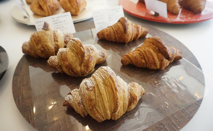 1.クロワッサン(プレーン) 国産小麦と海外の小麦を半々に混ぜて作っているクロワッサン。クロワッサンにはめずらしく、湯種製法を用いています。湯種を少し加えることで、外側はサクサク、中はもっちりとした食感に。 2.全粒粉のクロワッサン こちらはプレーンと比べると、よりザクザクとした食感を楽しめるクロワッサン。全粒粉の粉の甘みが引き立つクロワッサンです。 3.クロワッサンフロマージュ 「全粒粉のクロワッサン」にゴーダチーズをのせて焼き上げたもの。ゴーダチーズを使うことで、ちょっと苦味もあって◎。