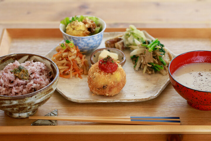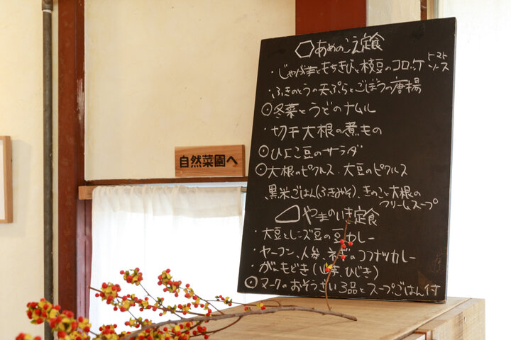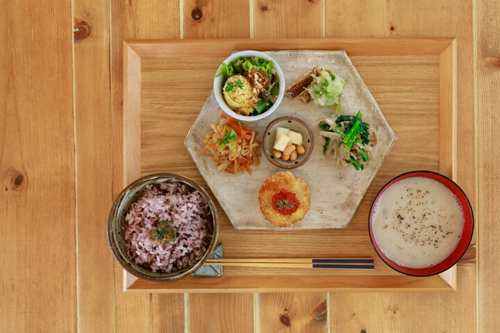 食事メニューは、6種の日替わり惣菜が付く「あめのこえ定食」と、2種のカレーに惣菜が付く「やまのいき定食」の2種類です。 いずれもメニューにも動物性の素材や小麦粉、砂糖は一切不使用。小麦粉の代わりに米粉を使い、みりんや甘酒などで甘みを付けています。