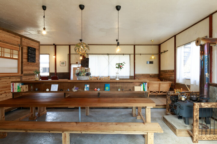 食堂の建物は、もとは精密機械工場だったそう。自分たちで天井や壁に漆喰を塗って改装したという店内は、温かみのあるとても居心地がいい空間です。店内中央に置かれた大きなテーブルやベンチも、裕幸さんが手作りしたのだそうですよ。