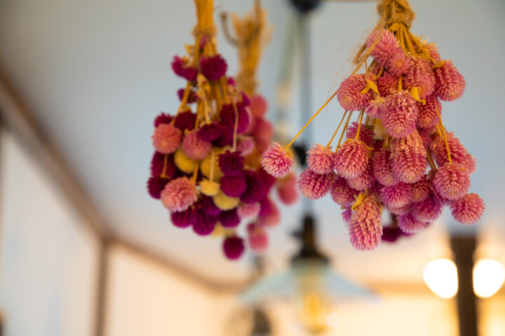 どこかで見たことがあるような家具とナチュラルなインテリアに、かわいいドライフラワーがしっくり馴染み、あたたかみのある空間を作り出しています。