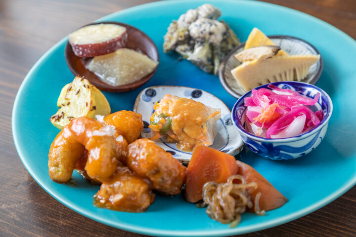 旬の野菜を主役にした主菜は月替わり。この日はゴーヤ、なす、こんにゃくのエビチリ風。衣にタレがしっかり絡み、味は濃厚ですが、ゴーヤの苦味、なすのとろける甘さ、こんにゃくの弾力、それぞれの特徴はしっかり伝わってきます。 副菜は日替わりで約6種。甘い、土っぽい、苦いなどの野菜の持ち味をバランス良く組み合わせて、食べ飽きないよう心がけていると言います。 ヴィーガンカフェとはいえ、かしこまった雰囲気はないため、身体にいいものを食べたいとき、気軽に訪れてみてくださいね。