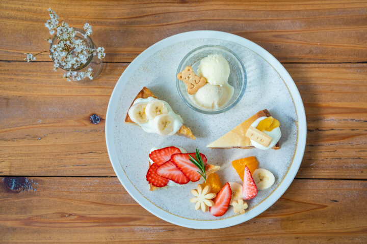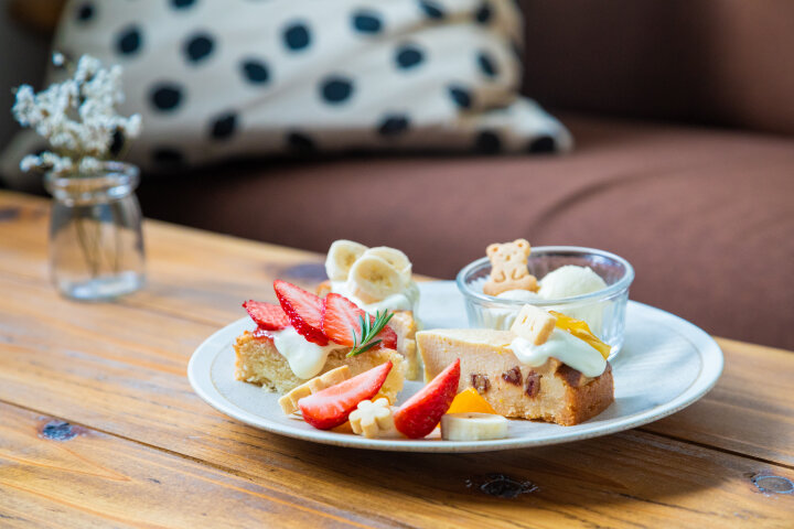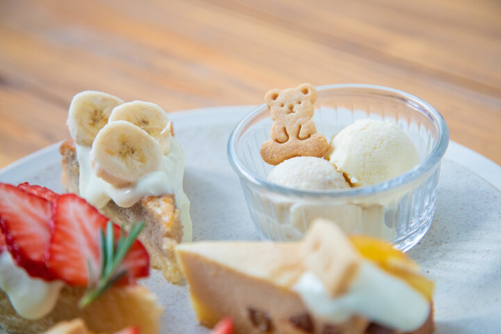 ティータイムにいただきたいのは、小麦粉不使用、グルテンフリーの自家製ケーキ3種、フルーツや野菜でつくったヴィーガンアイス、旬のフルーツを盛り合わせたデザートプレート。