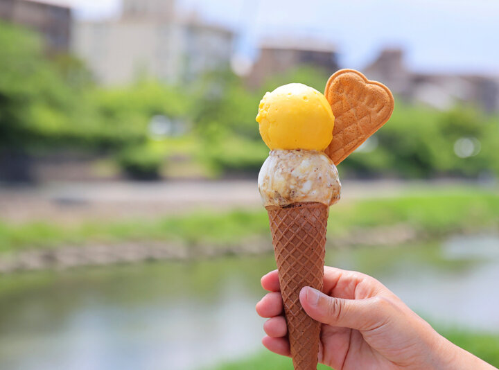 夏になると、鴨川の岸辺に並ぶ飲食店にはテラス席が設けられます。やさしい川風に吹かれながら納涼床で味わえるのは、和食から洋食、エスニックなどバラエティー豊かな京グルメです。そのなかの1軒、「BABBI」はイタリア発のウエハースとスイーツの専門店が手がける、ジェラテリアならぬ「ジェラ床」。鴨川や東山の風景を眺めながら、京の夏の暑さを忘れさせてくれる、本場イタリア仕込みのジェラートを味わってみませんか?