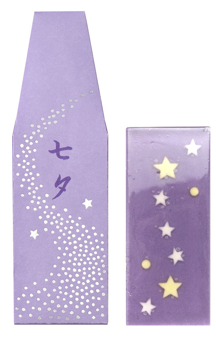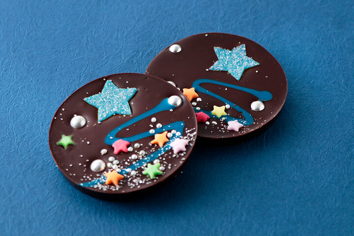 七夕の夜空をイメージしたビターチョコに星を散りばめたパレショコラ「ミルキーウェイ」。 ベースのチョコは、ベルアメールオリジナルのビターチョコレートを使用し、甘さ控えめでカカオの苦味も感じられる大人の味わいにまとめました。 天の川を渡り、年に一度だけ逢うことが許される二人のラブストーリーに想いを馳せ、色鮮やかに仕上げた期間限定のショコラです。
