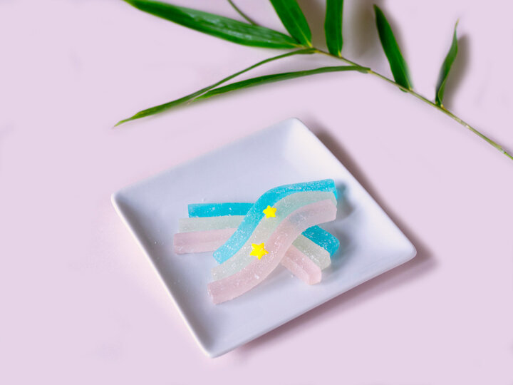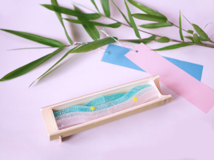 鳩サブレーで知られる鎌倉の銘店・豊島屋では、七夕の夜空を彩る天の川がモチーフになった「星乃橋(ほしのはし)」を、2023年7月7日まで一部店舗のみの期間限定で販売しています。鎌倉の若宮大路にある本店では毎年、七夕飾りもあしらわれていますよ。 「星乃橋」は竹製の涼しげな器に、ブルー、ピンク、ホワイトの3色の天の川、その中に「織姫」と「彦星」をイメージした2つの星をあしらった、日本で古くからある「七夕」のお話にちなんだお菓子。 天の川を表現しているのは、寒天や水飴を煮詰めた「錦玉」。織姫と彦星にみたてた星型のモチーフは、もち米、砂糖、水を練り合わせて型にした「雲平(うんぺい)」。どちらも江戸時代から伝わる和菓子の製法を用いて作られているのだそう。