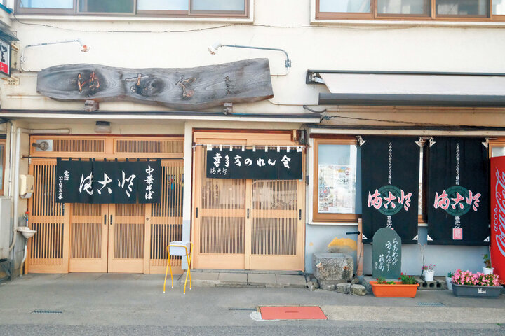 裏通りにある穴場のラーメン店。太さ5mm、厚さ3mmという極太幅広のちぢれ麺は手打ちで、あっさり味の透明なスープとよく絡んでいます。完成度の高さは喜多方でも有数と、地元でも評判です。
