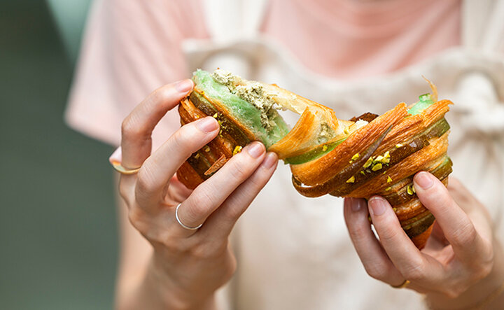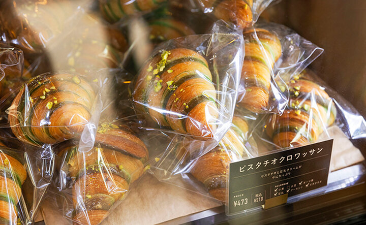 グリーンの層が綺麗な「ピスタチオクロワッサン」。 バターを使用していないので、クロワッサン特有のバターの香りはしないのですが、1口食べると仰天!!! 表面のクラストはパリッとフワッと軽く、口の中で解けていく食感はまさにクロワッサンそのもの。 バターの香りの代わりに、ピスタチオの青い香りが鼻をそそります♫