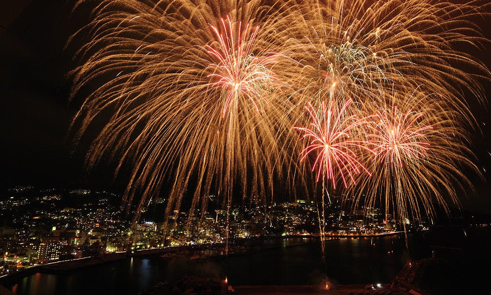 温泉街の名物花火は、壮大な大空中ナイアガラ「熱海海上花火大会」