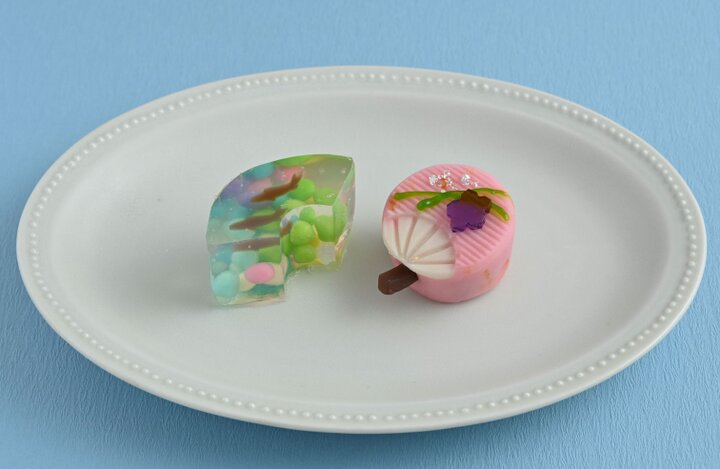 【夕涼み/右】 夏の宵、団扇で涼む情景が浮かんできそうなひと品。中には爽やかな酸味を感じる干し杏入り。 販売期間:8月中旬まで 価格:550円※うちわの柄は変更の場合あり 【清流/左】 鮎の解禁、鵜飼いの季節に合わせて店頭へ。鮎が川を泳ぐ様子を錦玉羹と羊羹で、光や景色で色々な見え方をする玉石はカラフルな餡玉で表現。 販売期間:8月中旬まで 価格:550円