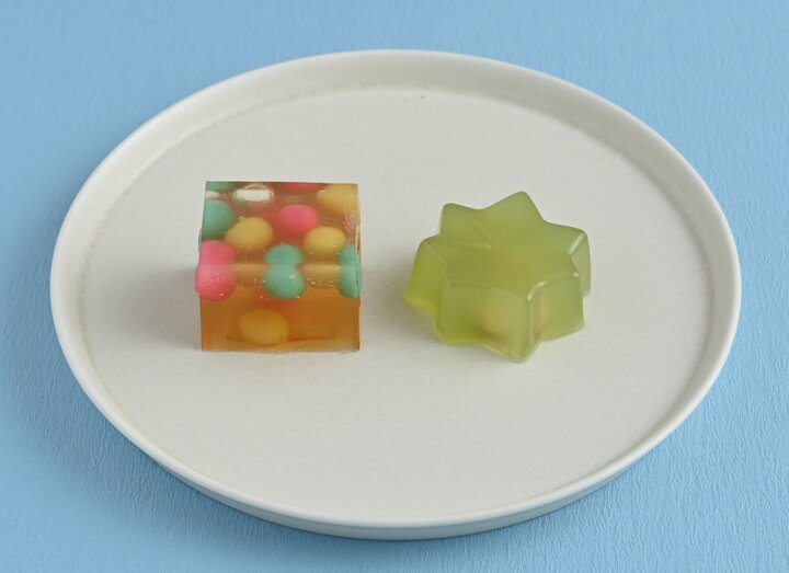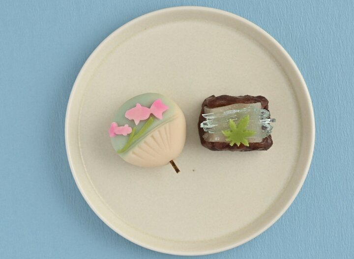 【⻘葉影/右】 青々とした緑に降り注ぐ夏の日差しをイメージ。ふるっとした食感の半錦玉(少し餡を入れた半透明の錦玉羹)に、涼やかな風が心地よく口の中を巡ります。 販売期間:8月中旬まで 価格:432円 【川面の花火/左】 夏の風物詩・花火が川面に移り光る情景を表したもの。ふわりと鼻から抜ける香り豊かな和三盆を用いた錦玉羹と、とろりとなめらかな餡の対比も印象的。 販売期間:8月中旬まで 価格:432円