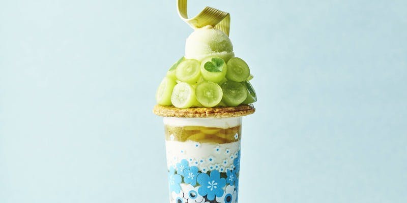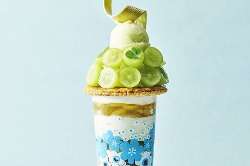 ストリングス・アデリアレトロ サマーフルーツパフェ「シャインマスカットパフェ」は、翡翠レモンティーで清涼感のあるパフェに。トップに惜しげもなく盛り付けたハーフカットと、レイヤードのなかのスライスはカットの違いで食感の違いが楽しめます。