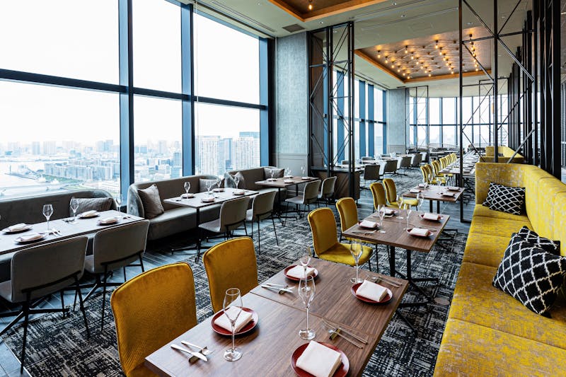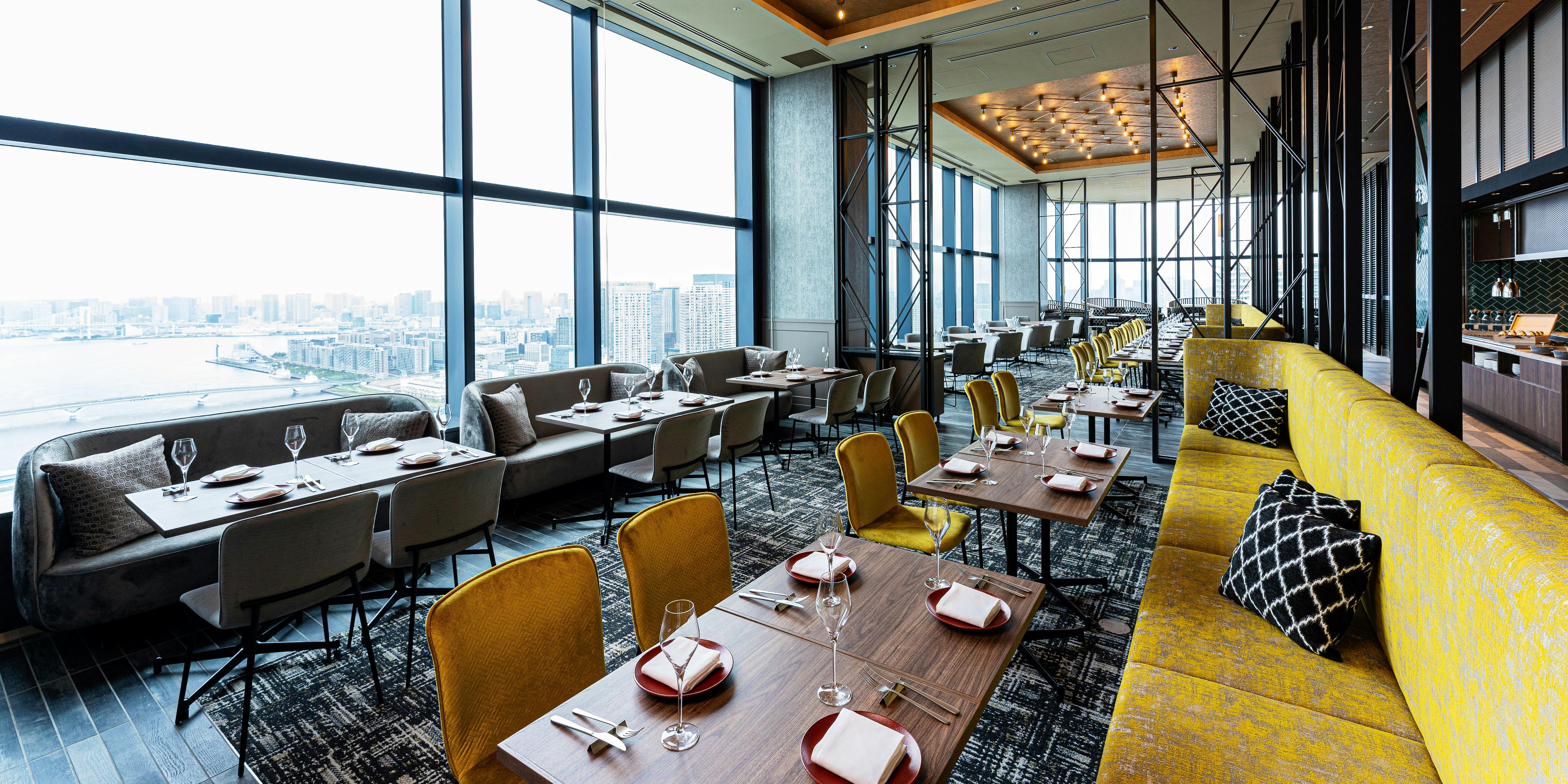 豊洲駅直結、東京のベイエリアを一望できるオールデイダイニング「THE PENTHOUSE with weekend terrace」。ホテル高層階の36階から見えるパノラミックな眺望は時間帯によって表情を変え、訪れる度にベイエリアの美しい景色を楽しめます。併設のテラスでは、心地よい風を感じながら開放的な気分で、贅沢なひと時を過ごすことができます。