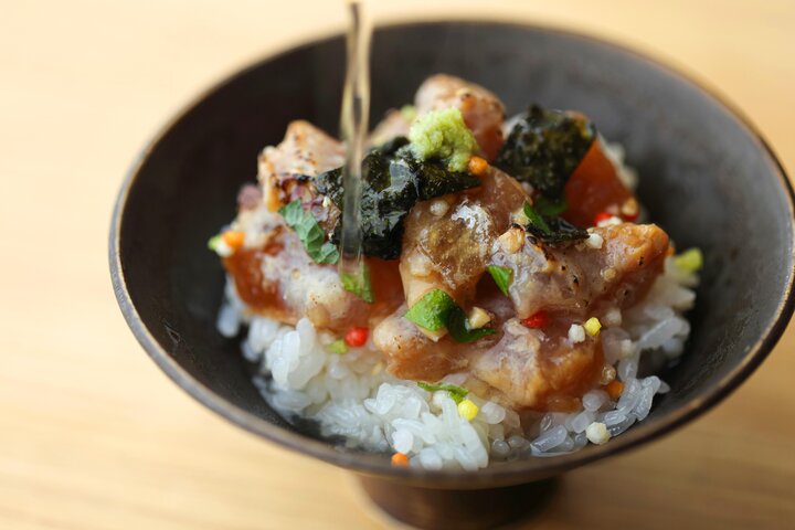 ごはんに生姜醤油と胡麻に漬け込んだ鯛の切り身をのせ、引き立ての香り高い出汁を注ぎます。出汁の旨味と鯛の旨味、そしてふわっと広がる芳醇な香り、贅沢すぎるお茶漬けですね。