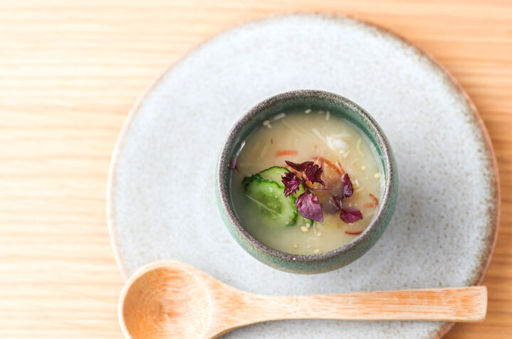 次は、サワラ節とアサリの出汁の白味噌仕立て。カツオに比べ、サワラは上品な香りと甘味があるそう。具には京都久在屋の豆腐を使い、薬味のシソやミョウガ、キュウリも涼やかな夏にふさわしい一品です。