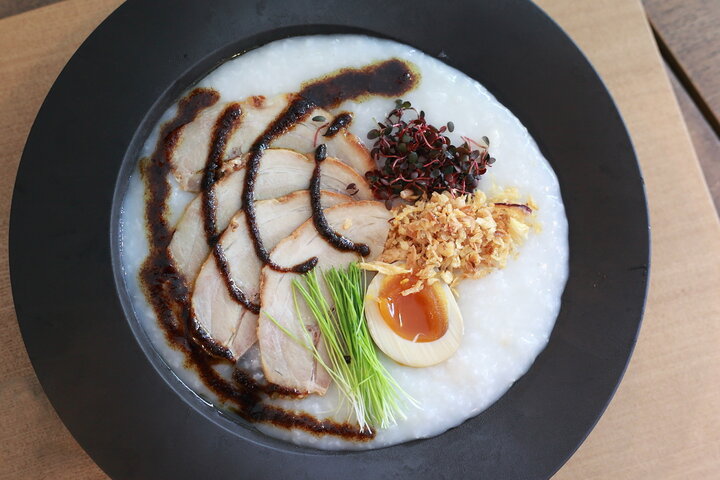 お粥は夜限定のスペシャルなメニュー「トムヤムクン粥」をぜひどうぞ。トムヤムクンを思わせる酸味と辛味の効いたペーストで味付けしたお粥に海老のから揚げ、セミドライトマト&揚げネギが添えられています。それぞれの具材から染み出す旨みが食べていくうちにどんどんと掛け合わさり、食が進みますよ。