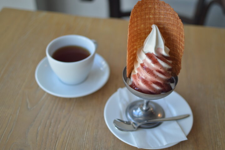 こちらに来たらぜひ味わいたいのが、季節メニューの「桃のサンデー」(1800円)。 広大な土地で牧草を種から育て、ストレスの少ない環境で良い飼料を食べて育った牛からとれた、乳脂肪分の高いまろやかなミルク「山のいぶき」で作ったソフトクリームに、熊本で作った採れたてのソルダム(すもも)のコンフィチュール、メレンゲとヨーグルトを合わせたもの。 ソフトクリームのやさしいおいしさとすももの酸味が体にすっとしみわたります。