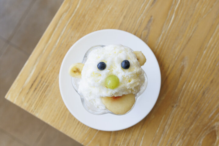 夏の季節は、かき氷「白いぬ」(1200円/テイクアウト900円)も味わうことができます。かき氷は約20センチもの高さがあり、「白いぬ」という名前の通り、上から見ると、犬の顔が表現されており、食べるのがもったいないくらいキュートです。 かき氷の味は、自家製の練乳味のかき氷シロップがベース。食べ進めていくうちに、季節のフルーツとパインソルベ、パッションフルーツなどが次々と出てきます。やさしいシロップとフルーツをからめながら食べ進めていく、楽しくておいしさが広がるかき氷です。