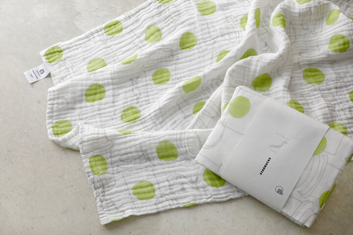 「蚊帳織5重ガーゼケットカップ」は奈良県の伝統産業である蚊帳織に着目し、商品を展開。蚊帳織とは、たて糸とよこ糸が、交互に粗く織られた平織りで、夏の夜、蚊や害虫を防ぐために、四隅をつって寝床を覆う“蚊帳”に使用されている織り方です。 今回の JIMOTO made Series では、昭和22年創業の奈良市内で蚊帳織の技術を伝承しながら、新しいことにチャレンジする大和織布とともに、オリジナルのガーゼケットを完成させました。綿100%の蚊帳生地を5枚重ねにしたガーゼケットは、ガーゼの素材が通気性を良くし、素材を重ねることで生まれる空気の層が、夏場は涼しく、冬場は暖かい、オールシーズンで使用できる商品に仕上げています。 デザインは、日本の伝統色である若草色のドット柄。そして、よく見てみると、このドット柄は隠し絵のようにレイアウトされたスターバックスのドリンクカップのデザインとなっています。さらにペーパーカップの脇には、地域の皆さんに親しみのある奈良公園の鹿のイラストを入れ、商品タグには、スターバックス、大和織布、奈良の名称を入れ、地域とのつながりを表現しています。