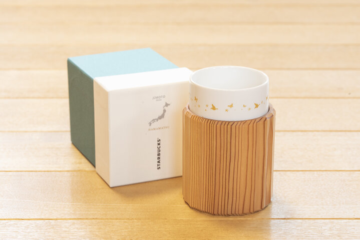 「天竜美林」と呼ばれる日本三大人工美林の一つとして、美しい景観とともに、良質な木材の産地とされている静岡県浜松市の天竜杉を使用したスリーブとカップのセット。浜松の恵まれた気候で育つ天竜杉は、根曲も少なくまっすぐな木に成長し、年輪のつまった美しい木目と優しい肌触りが特長です。天竜杉スリーブは、樹齢約80年以上の天竜杉をじっくりと時間をかけて天然乾燥し、丁寧に製材されたものを使い、形作っています。 形状は浜松の林業のルーツとつながる、かつての荒々しい天竜川の荒波をイメージ。手に持った時の木のぬくもり、手触りを考慮して20角柱のスリーブを1点1点手作業で丸みを出すように角を落とし、木のあたたかな印象を残すとともに、天竜杉がもつ色や木目の美しい表情が楽しめるスリーブに仕上げました。使い込んでいくうちに手触り、色味など時間とともに少しずつ変化し、木がもつ味わいをじっくりと楽しめるのも特長です。 セットの白いカップには、天竜川の荒波を描くとともに、スターバックスを象徴するコーヒーやコーヒーの花、市の鳥のウグイスやみかんの花など、スターバックスや浜松にまつわるものをアイコンとしてちりばめています。さらに、天竜杉スリーブの底面には、スターバックス、永田木材(生産者)、浜松(コミュニティ)の名称を入れ、地域とのつながりを表現しました。