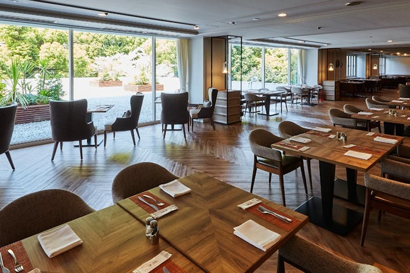 天井高約7メートル、南西側が全面ガラスの開放感にウッド調のしつらえが落ち着きを醸し出す空間で、和洋中バラエティに富んだブッフェを提供する「オールデイダイニング グランドエール」。ファミリーでも安心して快適に過ごせるよう子ども向けのメニューやアイテムも用意されているほか、世界の代表産地から取り揃えたワイン・シャンパンをはじめアルコールメニューも充実しています。