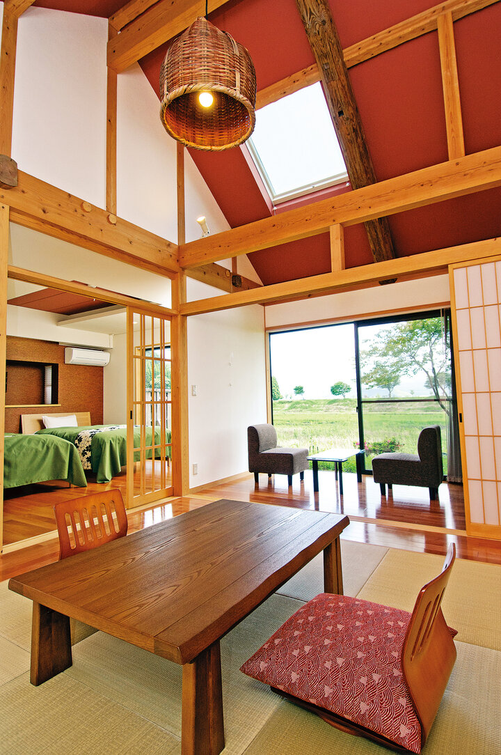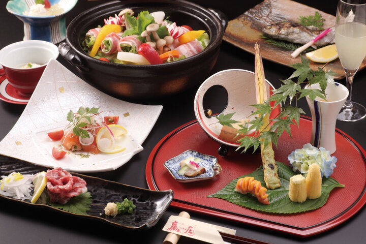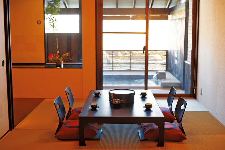 阿蘇山麓の温泉宿が点在する阿蘇内牧温泉に建つ一軒宿。10棟の離れは、平屋や2階建て、バリアフリーなど造りが異なりますが、いずれも大きめの専用風呂が付いています。夕食はあか牛や馬刺し、旬の山菜などを盛り込んだ創作会席料理を、専用の個室でいただくことができます。