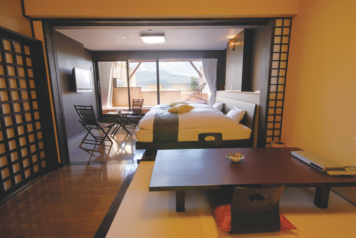 歴史ある内牧温泉に建つ宿。全94室の客室は、露天風呂付きや好展望の和室などさまざま。人気は展望露天風呂が付く特別室で、風呂からは阿蘇五岳と阿蘇の町並みを一望することができます。
