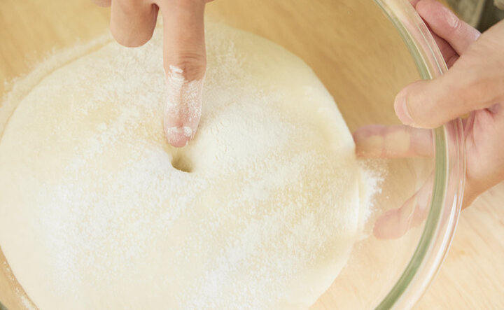 ・生地をボウルに戻し、30度の温度で60分発酵させます。 ※生地が乾燥しないように濡れ布巾をかぶせましょう。