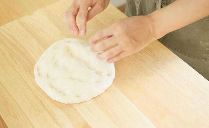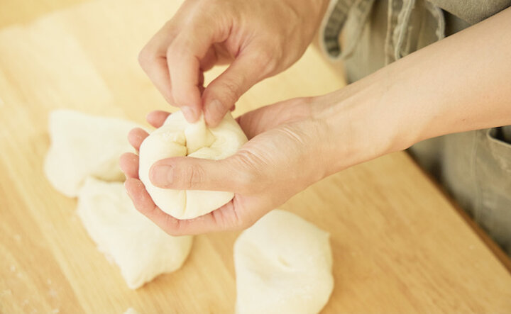・生地に打ち粉をしてから台の上に出し、1個80gの5等分にカットします。 ・カットした生地を、端を中心に寄せるようにして軽く丸めます。