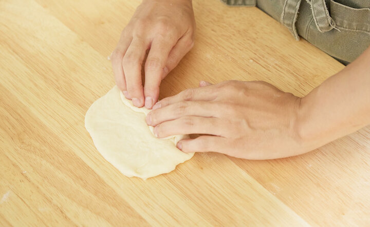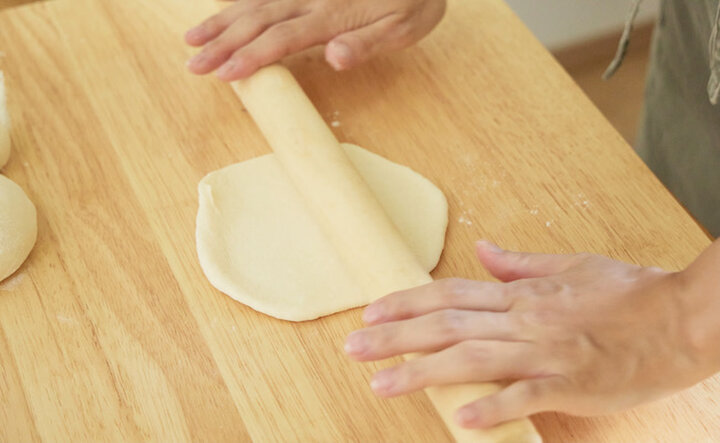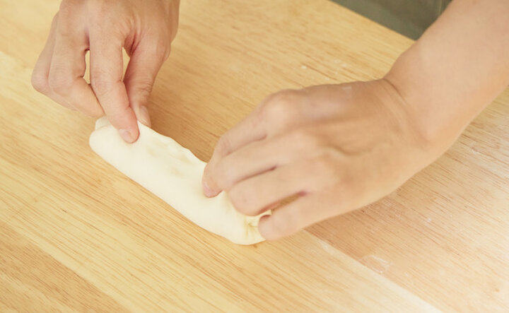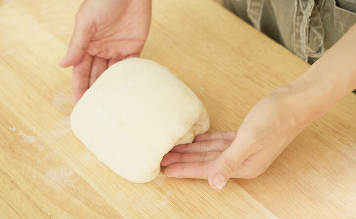 ・生地を軽く叩いてガスを抜き3つ折りをします。その後、向きを90度変えて上から軽く巻くようにして丸めていきます。