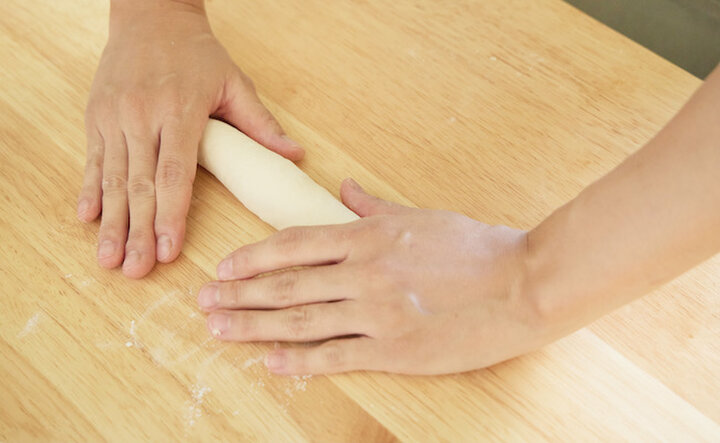 ・下からくるくると巻き棒状にし、とじ目をしっかりとつまんでから転がして長さ15㎝まで伸ばします。