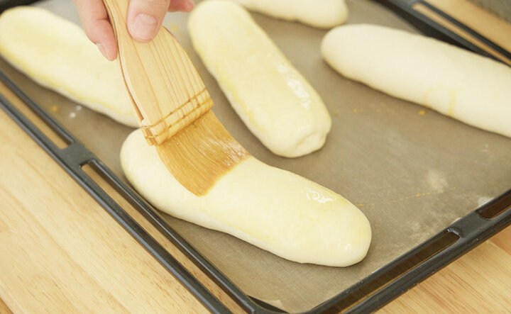 ・発酵前の1.5~2倍程度に膨らんだら、表面に溶き卵(分量外)を刷毛で塗ります。 ※塗らなくてもOK。 ・220℃に予熱をしておいたオーブンに天板を入れ、8分間焼きます。 ※オーブンの機能によって、時間や温度は調整する。