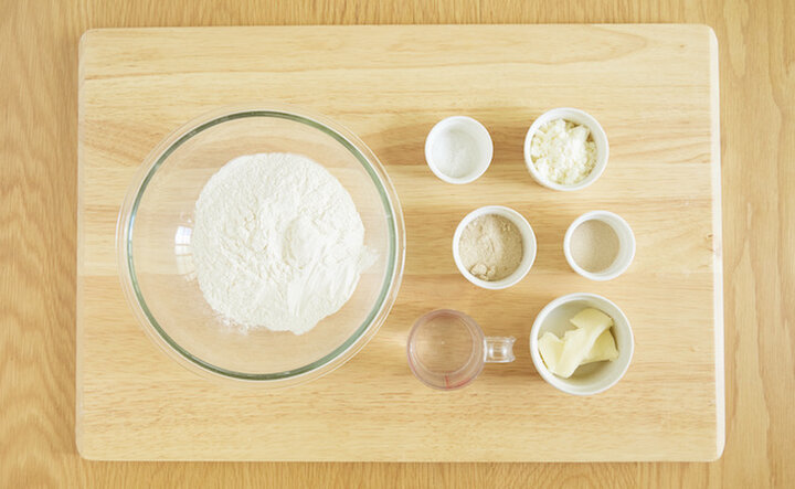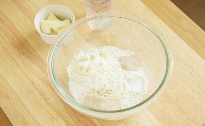 ・インスタントドライイーストを水に加え、1分間置いておきます。 ・バター以外の材料をボウルに入れ、まんべんなく混ぜます。