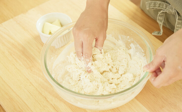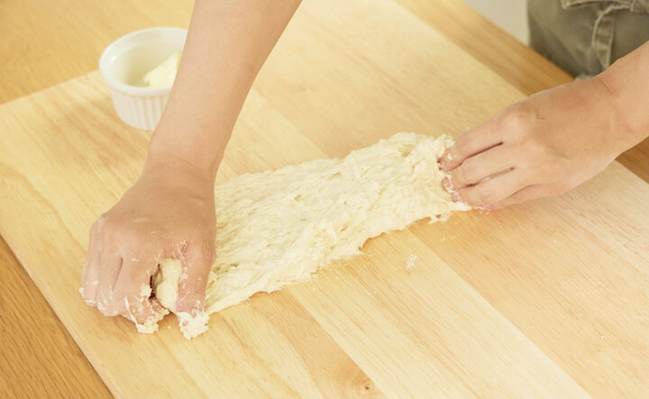 ・粉っぽさがなくなったら平らな場所に出し、台にこすりつけるようにして約5分間捏ねます。生地がまとまりはじめたら、常温に戻したやわらかい無塩バターを生地にのせ、なじむまで約5分間捏ねます。