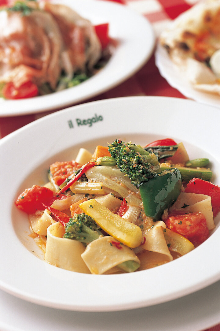 フレッシュトマトと高原野菜1485円は自家製幅広パスタのメニュー。気まぐれなピッツァ2080円もおすすめ