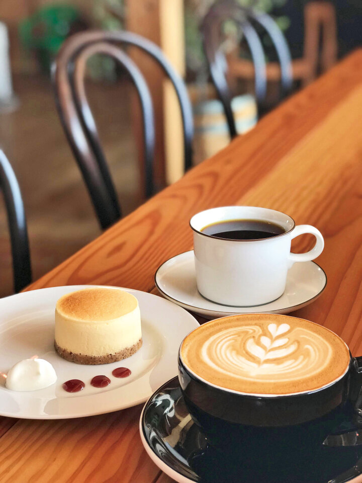 ハンドドリップコーヒー530円、カフェラテ580円、しっとりなめらかな自家製チーズケーキ480円