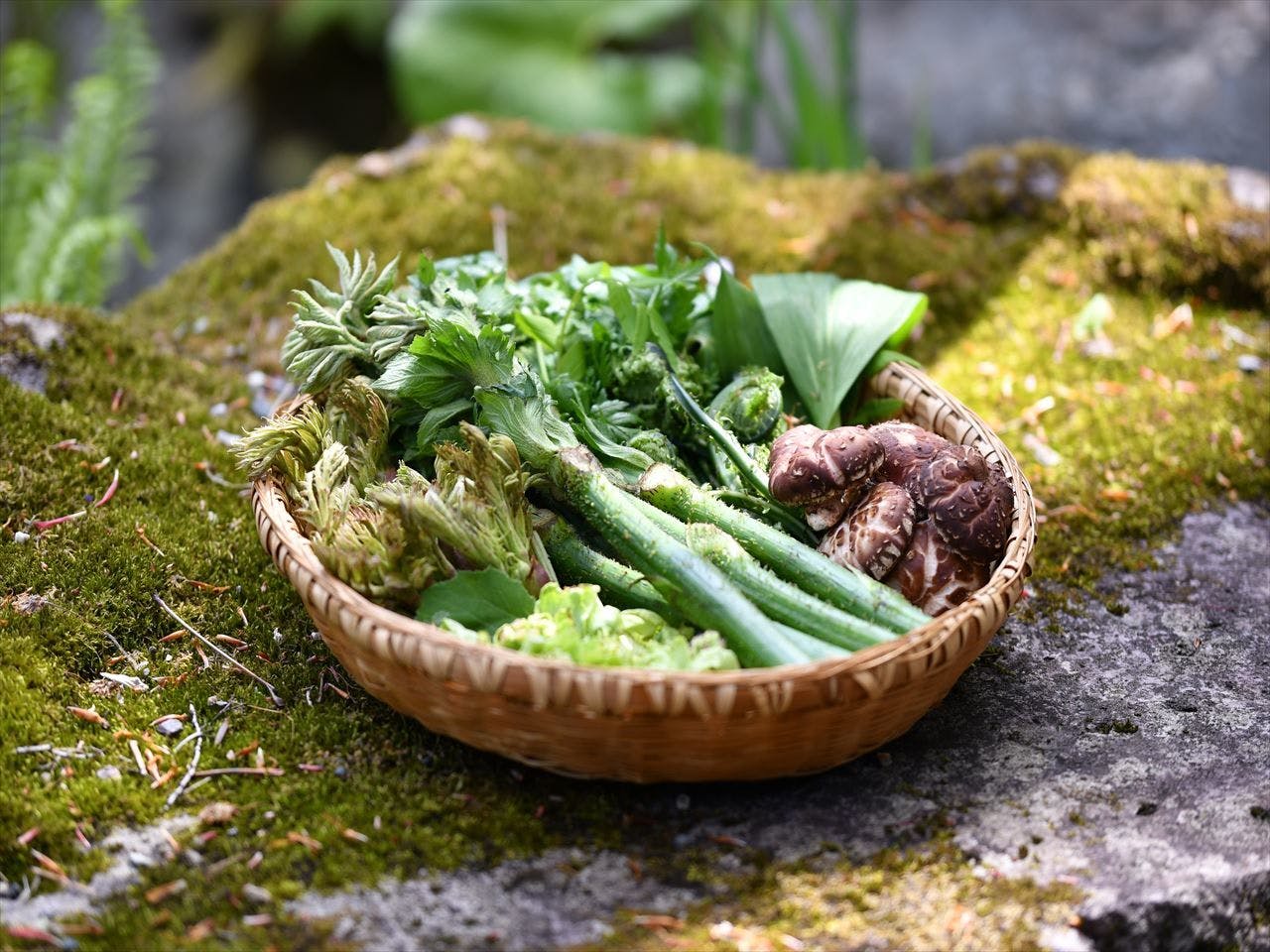 食事は、野菜はもちろん、お肉も群馬県が誇るブランド肉を使用。甘みとみずみずしさが特徴の野菜たちは、直接農家に足を運び仕入れを行っています。春には山菜を摘みに野山へ出向き、夏は利根川の鮎、秋にはきのこや栗を収穫。宿の料理をきっかけに、みなかみの食材と自然の良さを知ってほしいという思いが込められています。