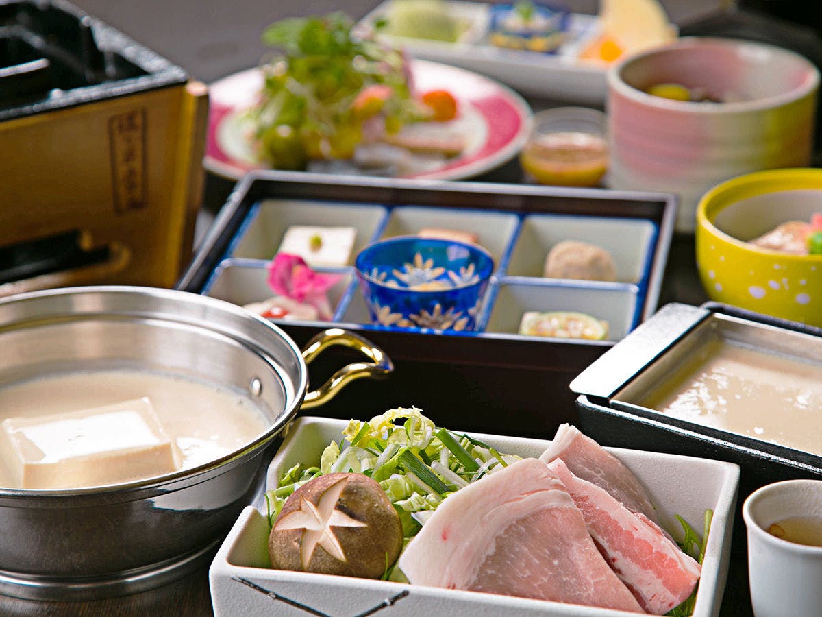 食事は、上質の国産大豆と三国山系の清らかな水を用いて作られた豆腐製品と旬の素材を、高級料亭や茶懐石旅館で修業した調理長の技で仕立てた上品な懐石料理を味わうことができます。