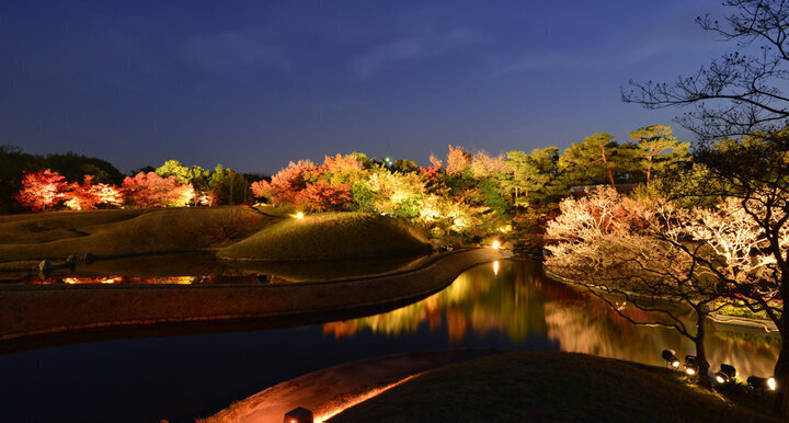 2019年に開業したJR梅小路京都西駅に隣接し、京都駅からも徒歩15分の「梅小路公園」。水族館や鉄道博物館、芝生広場、大型遊具などもある大型の都市公園です。 園内には150本ほどのモミジがあり、見頃に合わせて「梅小路公園紅葉まつり」を実施。2023年11月10日~26日には、約9000㎡の広さを誇る日本庭園「朱雀の庭」のライトアップも行われます。暗闇の中で池の水面に浮かび上がるモミジや松は幻想的な美しさです。