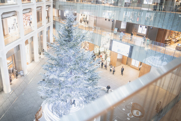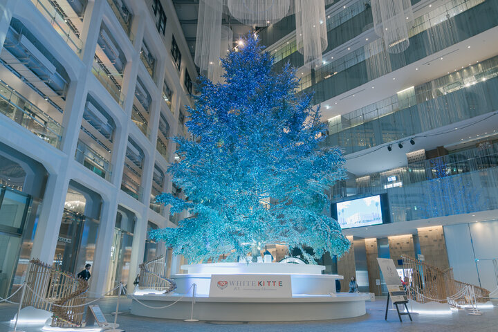 JPタワー商業施設「KITTE」のクリスマスイベントのテーマは「10th Anniversary Christmas~想い重ねるクリスマス~」。開催期間中、1階アトリウムには本物のモミの木を使用した全長約13mのメインツリー「White Layer Tree」が出現。 上空に浮かぶ最大13mにも及ぶ真っ白のストリングスの層や、ツリーの根本に灯る年輪の光で、開業から10年間で積み重ねてきた時間を感じられる空間を演出します。